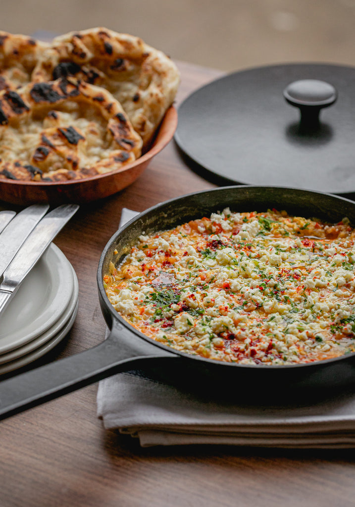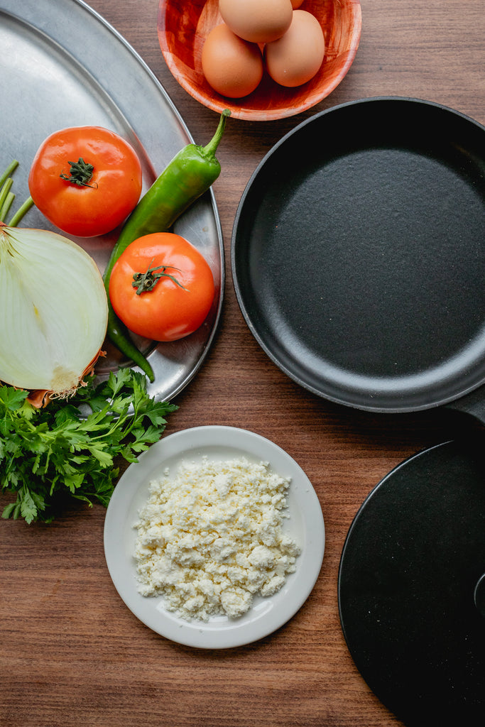 A Turkish breakfast staple; tomatoes, peppers and onions scrambled with eggs, which are then topped with sour Tulum cheese.