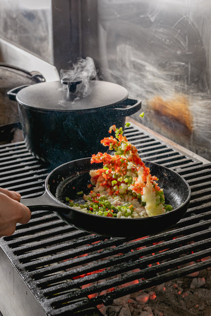 Start by preparing your vegetables. Slice your Peppers in half and deseed, then proceed to brunoise or finely chop. Do the same with your Onion and set aside together.